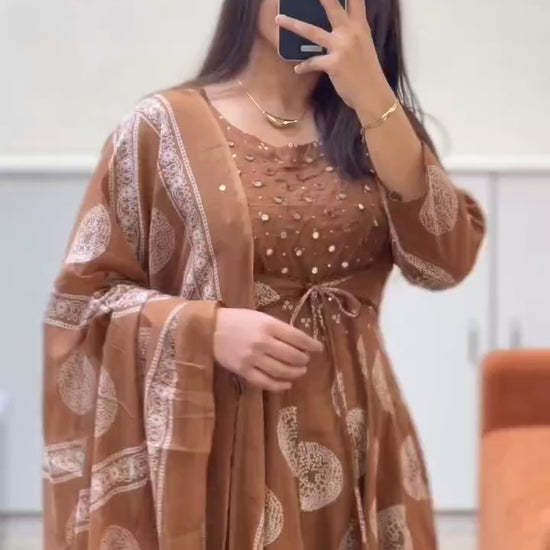 This elegant brown cotton printed Anarkali set features an attached jacket that adds a contemporary touch to the traditional silhouette. Paired with matching pants and a coordinating dupatta, it offers a complete ensemble that balances comfort and style. The breathable cotton fabric ensures ease of wear, making it suitable for both casual and festive occasions. Perfect for those seeking a refined yet effortless ethnic look.