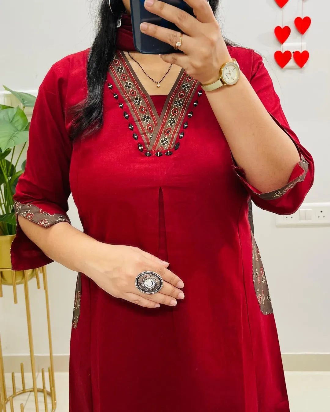 Rust Premium Dhabu Cotton Kurti Set with Applique Work & Cotton Dupatta