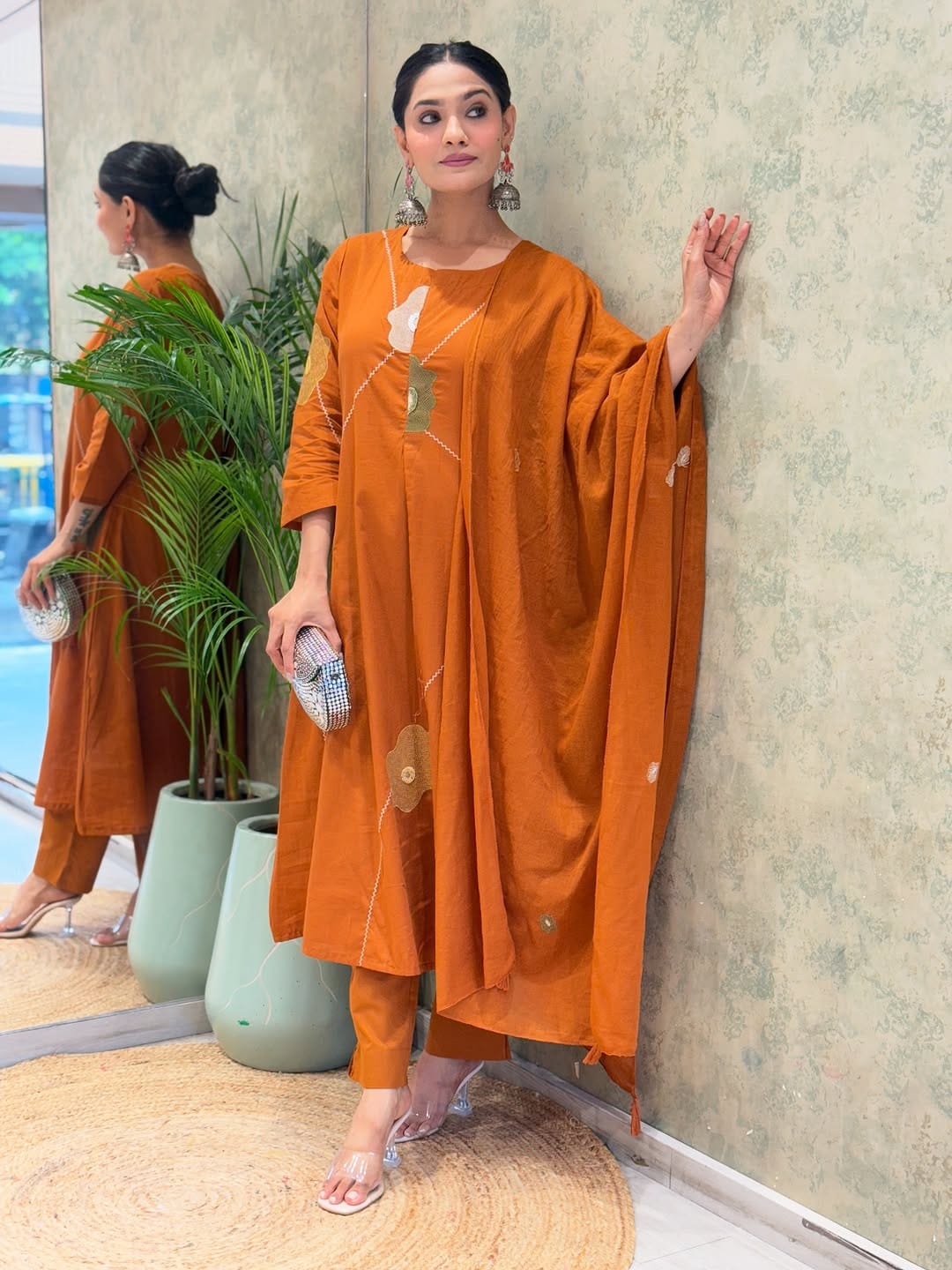 Rust Orange Embroidered Cotton Anarkali Set with Dupatta