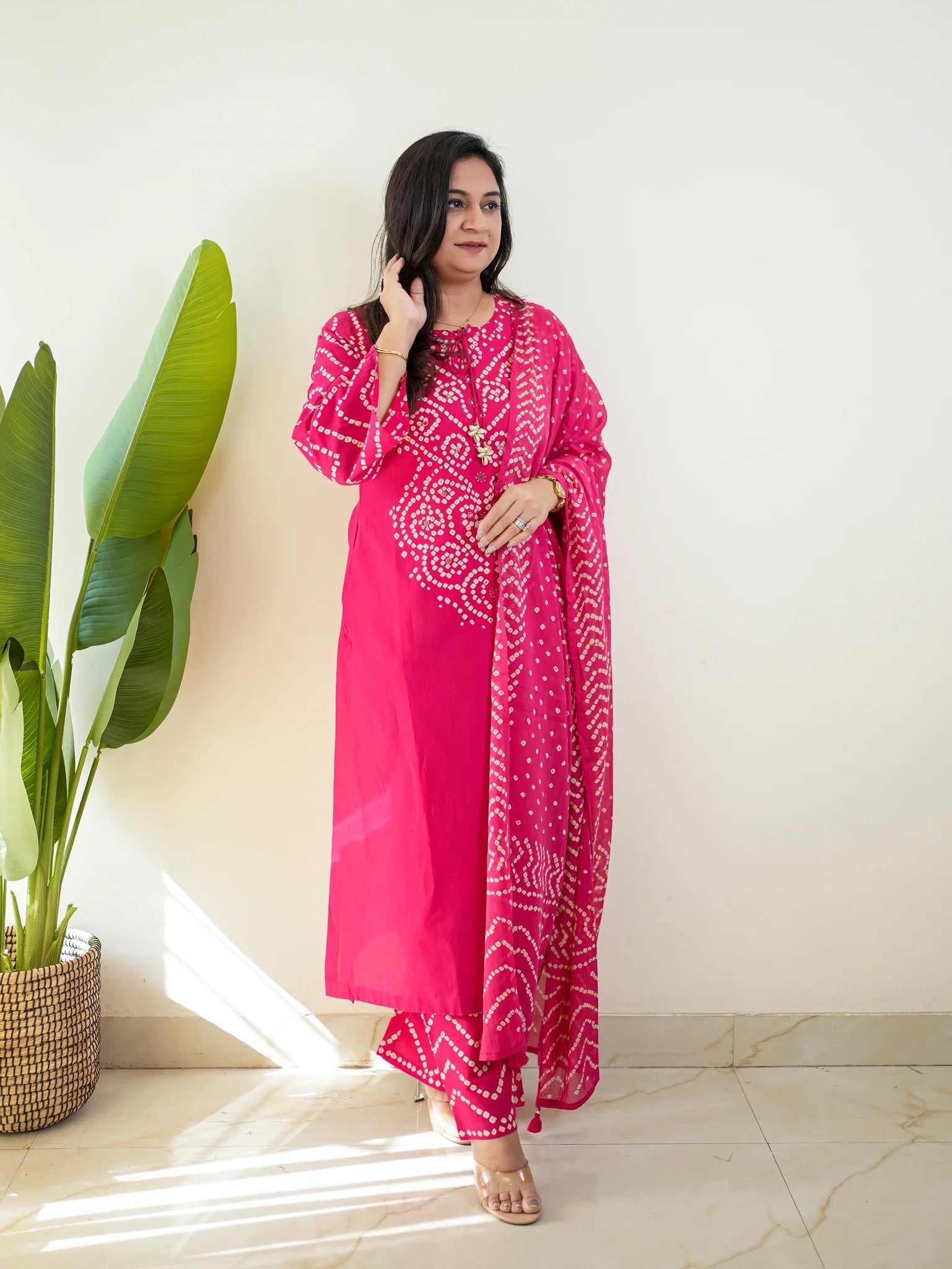 Women’s Bandhani Print Cotton Kurti Palazzo & Dupatta Set – Pink